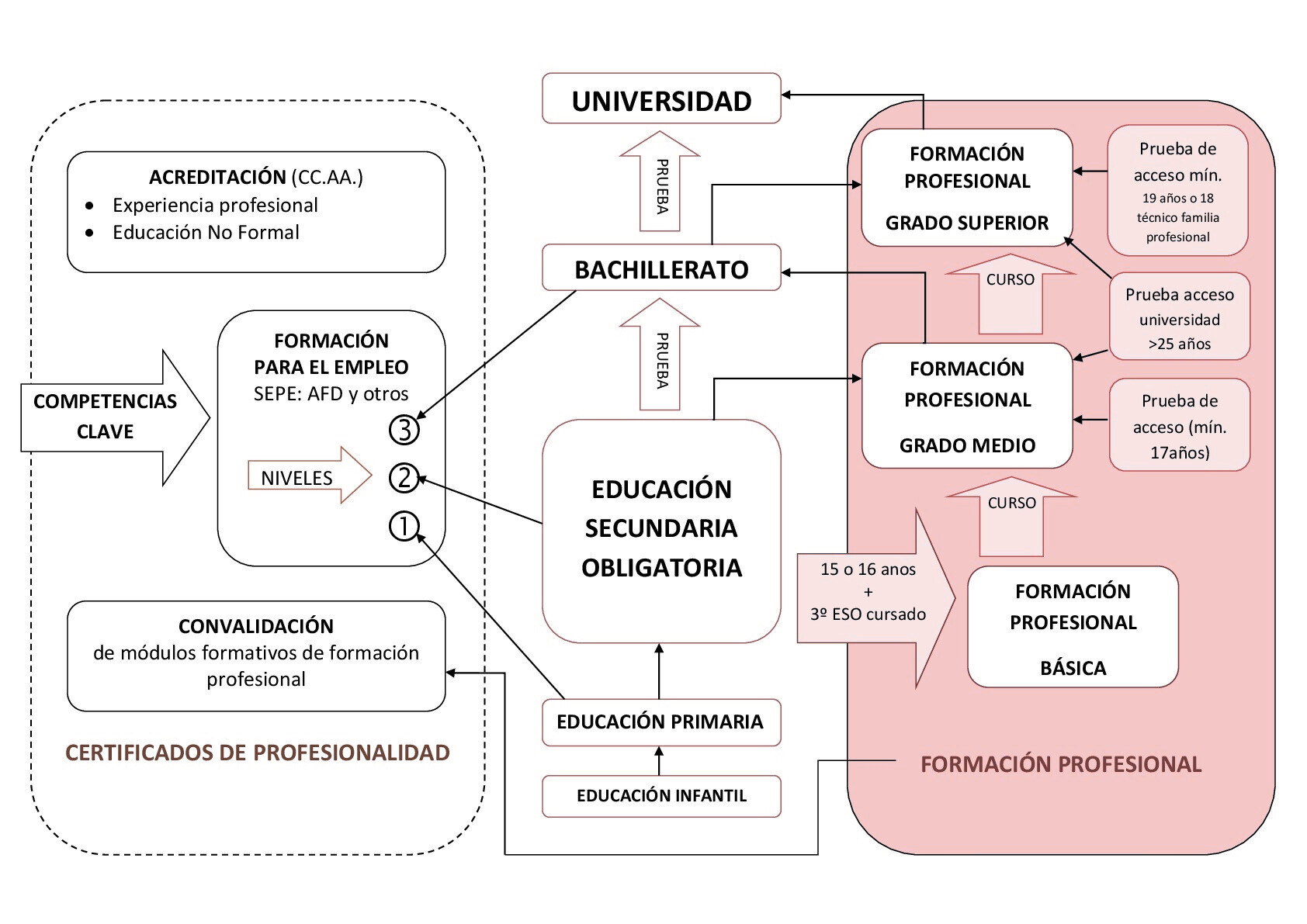 La Formación Profesional, por su parte, se divide en tres niveles: Básica, de Grado Medio y de Grado Superior, ofreciendo una formación más práctica y orientada al empleo. Desde los grados medio y superior también se puede acceder a estudios superiores o universitarios mediante pruebas específicas.